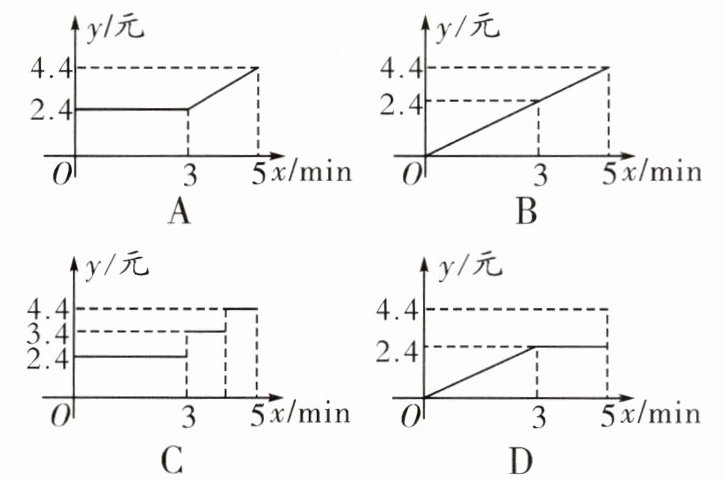 7. 从甲地向乙地打长途电话的收费标准为:不超过$3 \min收费2.4$元,以后每增加$1 \min加收1$元(不足$1 \min按1 \min$计算). 若通话时间不超过$5 \min$,则表示电话费$y$(元)与通话时间$x$($\min$)之间的函数关系的图象(如图所示)正确的是(