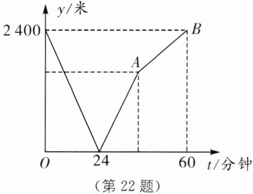 22. 学校与图书馆在同一条笔直道路上,甲从学校去图书馆,乙从图书馆回学校,甲、乙两人都匀速步行且同时出发,乙先到达目的地. 两人之间的距离$y$(米)与时间$t$(分钟)之间的函数关系如图所示.