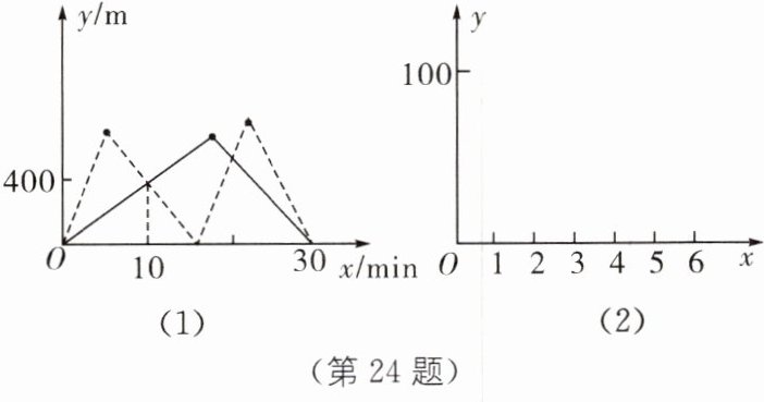 父亲和儿子同时出去晨练,如图(1),实线表示父亲离家的路程$y$($\mathrm { m }$)与时间$x$($\mathrm { min }$)的函数图象;虚线表示儿子离家的路程$y$($\mathrm { m }$)与时间$x$($\mathrm { min }$)的函数图象. 由图象可知,他们在出发$10 \mathrm { min }$时第一次相遇,此时离家$400 \mathrm { m }$;晨练了$30 \mathrm { min }$,他们同时到家.