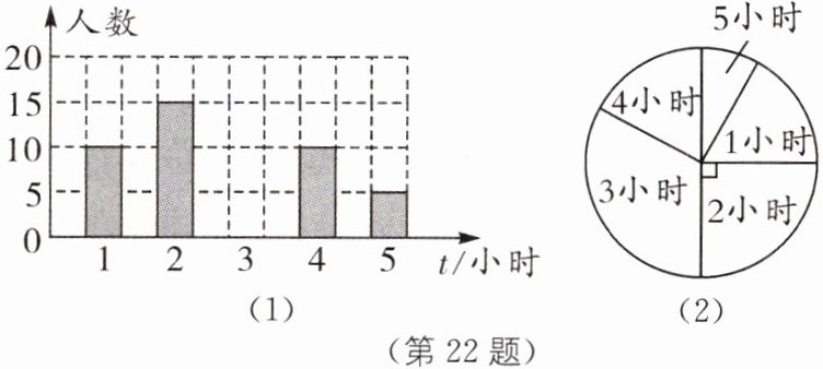 22. 为了了解某学校七年级学生每周平均课外阅读时间的情况,随机抽查了该学校七年级m名同学,对其每周平均课外阅读时间进行统计,绘制了条形统计图(如图(1))和扇形统计图(如图(2)):