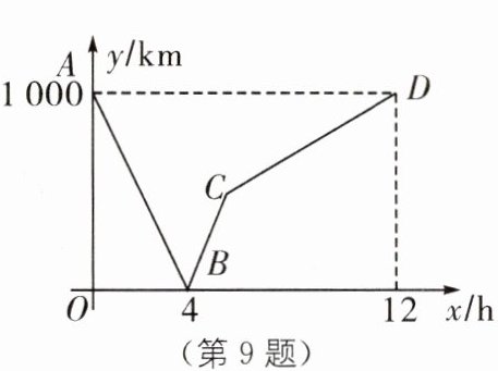 9. 如图,一列快车从甲地驶往乙地,一列慢车从乙地驶往甲地,两车同时出发,设慢车行驶的时间为$x(\text{h})$,两车之间的距离为$y(\text{km})$,图中的折线表示$y与x$之间的函数关系. 下列说法中正确的是(