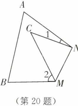 20. (1)如图,在三角形纸片$ABC$中,$\angle A= 64^{\circ}$,$\angle B= 76^{\circ}$,将纸片的一角折叠,使点$C落在\triangle ABC$内部,折痕为$MN$。如果$\angle 1= 17^{\circ}$,求$\angle 2$的度数。