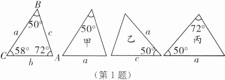 1. 下列各图中$a$,$b$,$c$为三角形的边长,则甲、乙、丙三个三角形和左侧$\triangle ABC$全等的是(