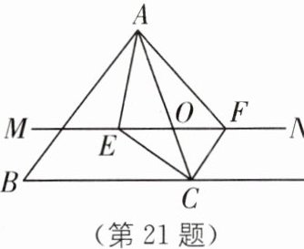 21. 如图,在$\triangle ABC$中,$O是边AC$上(端点除外)的一个动点,过点$O作直线MN// BC$。设$MN交∠BCA的平分线于点E$,交$∠BCA的外角平分线于点F$,连接$AE$,$AF$。那么当点$O$运动到何处时,四边形$AECF$是矩形?并证明你的结论。