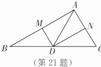 21. 如图,在 $ \triangle ABC $ 中,$ AD $ 是边 $ BC $ 的中线,点 $ M $ 在 $ AB $ 边上,点 $ N $ 在 $ AC $ 边上,并且 $ \angle MDN = 90^{\circ} $。若 $ BM^{2} + CN^{2} = DM^{2} + DN^{2} $,求证:$ AD^{2} = \frac{1}{4}(AB^{2} + AC^{2}) $。