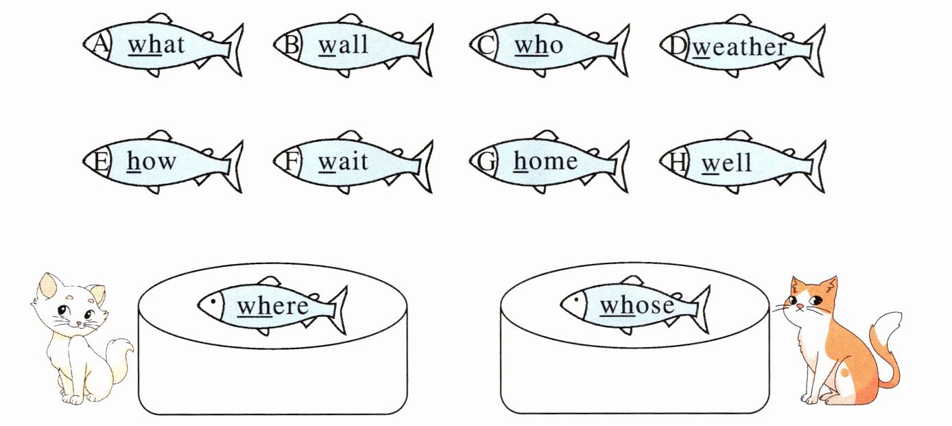 一 两只小猫正在挑选自己喜欢的鱼,请根据它们已经挑好的鱼,把剩下的鱼分给它们吧。(只写序号)