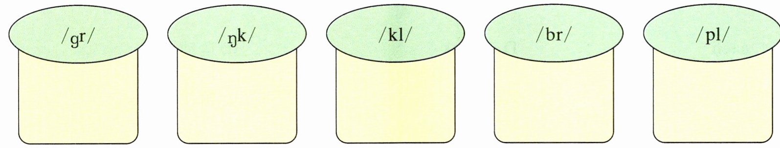 /gr/:②⑩ /ŋk/:①⑧ /kl/:⑤⑨ /br/:③⑦ /pl/:④⑥