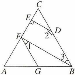 $BF⊥AC$.理由如下:$\because ∠AGF=∠ABC,\therefore GF// BC.\therefore ∠1=$