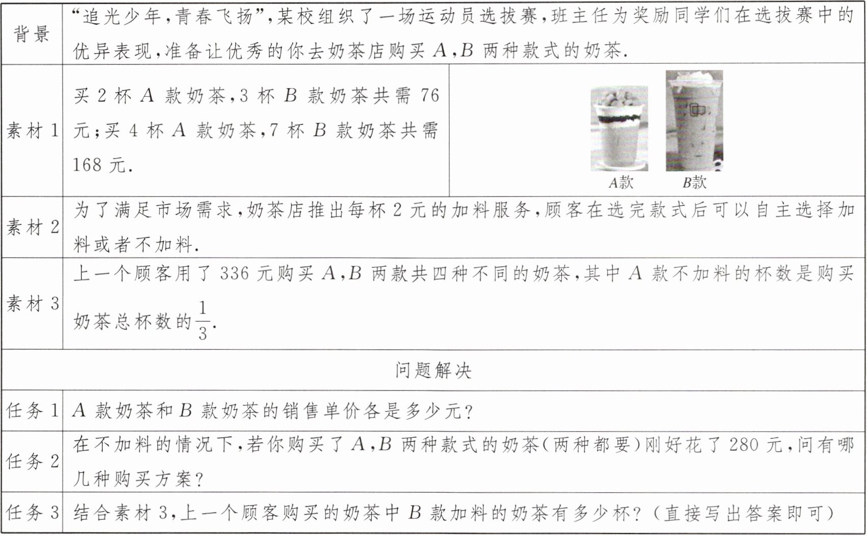 任务1:$A$款奶茶单价$\boldsymbol{14}$元,$B$款奶茶单价$\boldsymbol{16}$元。