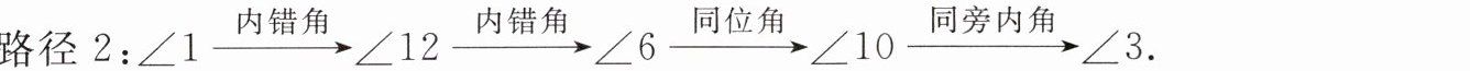 (1)路径:$∠1\xrightarrow{内错角}∠12\xrightarrow{同旁内角}∠8$(答案不唯一).