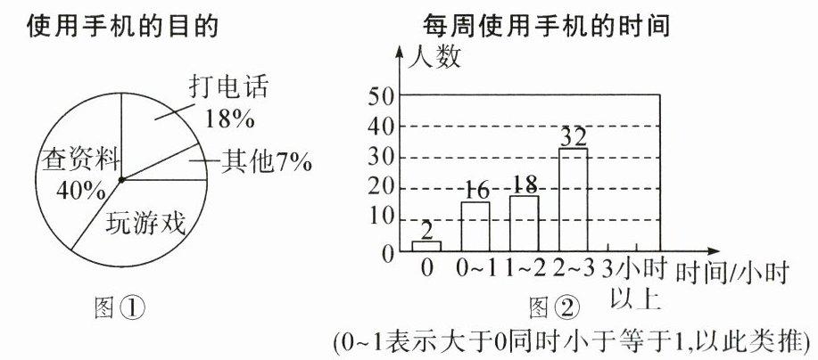 22. (10分)为了解学生使用手机的情况,某学校开展了“手机伴我健康行”主题活动,随机抽取部分学生进行“使用手机的目的”和“每周使用手机的时间”的问卷调查,并根据调查结果绘制成如图①②所示的统计图,已知“查资料”的人数是40人.