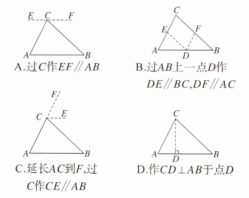 5.在探究证明“三角形的内角和是$180^{\circ }$”时,综合实践小组的同学作了如下四种辅助线,其中不能证明“三角形内角和是$180^{\circ }$”的是( )
