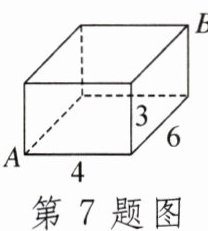 7.如图是一块长、宽、高分别是6cm,4cm和3cm的长方体木块.一只蚂蚁要从长方体木块的一个顶点A处,沿着长方体的表面到长方体上和A相对的顶点B处吃食物,那么它需要爬行的最短路径的长是$ ( )A.\sqrt{85}cm B.\sqrt{97}cm C.\sqrt{109}cm D.9cm$