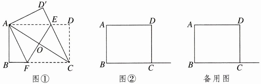 如图①,将矩形纸片ABCD沿直线EF折叠,使得点C与点A重合,点D落在点D'的位置,连接EC,AF,AC,线段AC交EF于点O。
