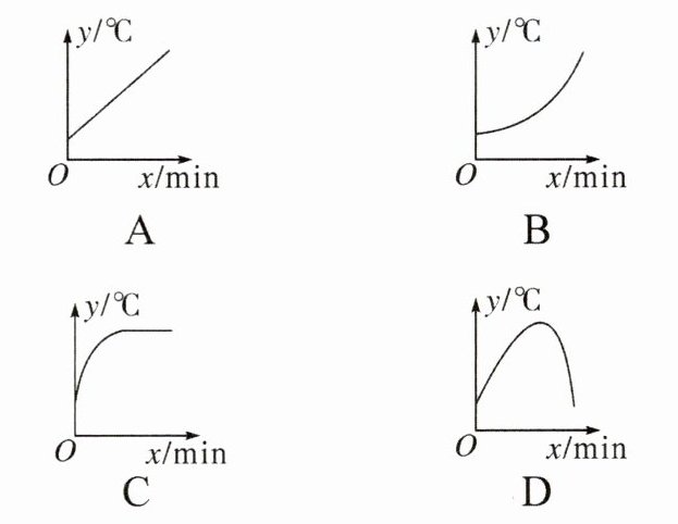 1. 将常温中的温度计插入一杯 $ 60 ^ { \circ } \mathrm { C } $ 的热水(恒温)中,温度计的读数 $ y $($ ^ { \circ } \mathrm { C } $)与时间 $ x $(min)的关系用图象可近似表示为( )