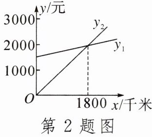 2. 小红爸爸的公司急需用车,但又不准备买车,公司准备和一个个体车主或一家出租车公司签订月租车合同,设汽车每月行驶x千米,个体车主收费为$y_1$元,出租车公司收费为$y_2$元,观察图象可知,当x______时,选用个体车主较合算.