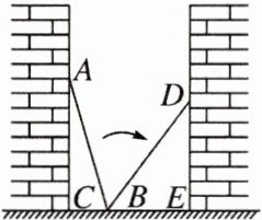 解:设此时梯子底端 B 到右墙脚点 E 的距离是 x 米,则 BC 为$(2.2-x)$米.由题意可知$AC=2.4$米,$DE=$$2$米,$AB=DB$.在$Rt\triangle ABC$和$Rt\triangle DBE$中,由勾股定理得$AB^{2}=BC^{2}+AC^{2}$,$DB^{2}=BE^{2}+DE^{2}$,$\therefore BC^{2}+AC^{2}=BE^{2}+DE^{2}$,即$(2.2-x)^{2}+2.4^{2}=$$x^{2}+4$,解得$x=1.5$.故此时梯子底端 B 到右墙脚点 E 的距离是 1.5 米.