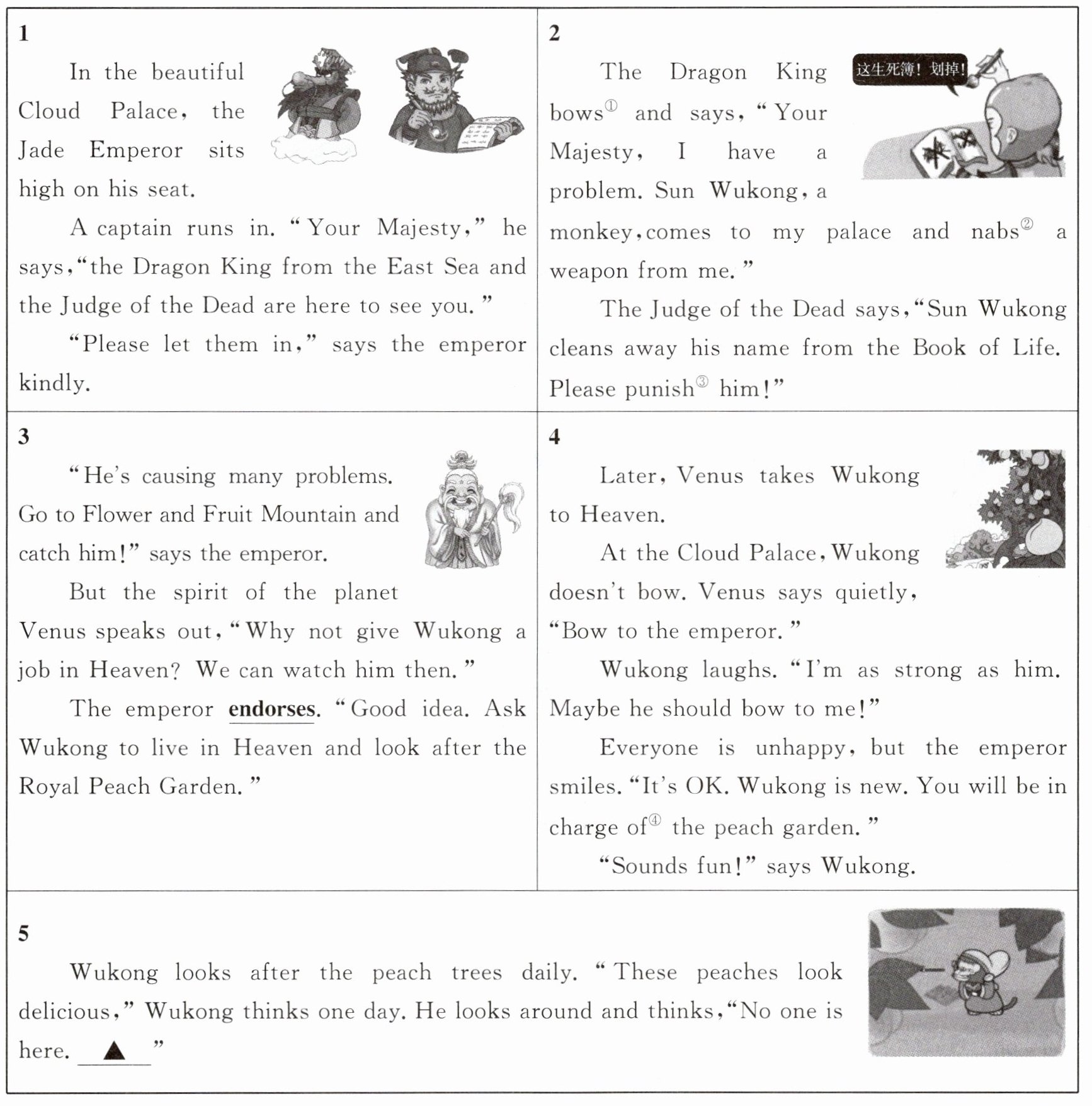 【参考译文】 1. 在美丽的云霄宝殿里,玉皇大帝高高地坐在座位上。 一位士兵跑了进来。“陛下,”他说:“东海龙王和阎王来见您了。” “请让他们进来,”玉帝和蔼地说。 2. 龙王鞠了一躬,说:“陛下,我有个问题。孙悟空,一只猴子,来到我的宫殿,从我这里抢了一件武器。” 阎王说:“孙悟空把自己的名字从生死簿上抹去了。请惩罚他!” 3. “他在制造很多麻烦。去花果山捉拿他!”玉帝说。 但太白金星发声说:“为什么不给悟空一份天庭的工作呢?到时候我们可以看着他。” 玉帝同意了。“好主意。让悟空住在天庭,照看蟠桃园。” 4. 后来,太白金星把悟空带到了天庭。 在云霄宝殿,悟空没有鞠躬。太白金星小声地说:“向玉帝鞠躬。” 悟空笑了。“我和他一样厉害。也许他应该向我鞠躬!” 大家都很不高兴,但玉帝笑了。“没关系。悟空是新来的。你将负责看管桃园。” “听起来很有趣!”悟空说。 5. 悟空每天照看桃树。“这些桃子看起来很好吃,”有一天悟空想。他环顾四周心想,“这儿一个人都没有。也许我可以吃一个。” ——选自《西游记》