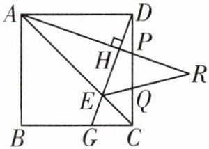 如图,在正方形 $ABCD$ 中,点 $P$,$Q$ 是 $CD$ 边上的两点,且 $DP = CQ$,过 $D$ 作 $DG⊥AP$ 于 $H$,分别交 $AC$,$BC$ 于 $E$,$G$ 两点,$AP$,$EQ$ 的延长线相交于 $R$.