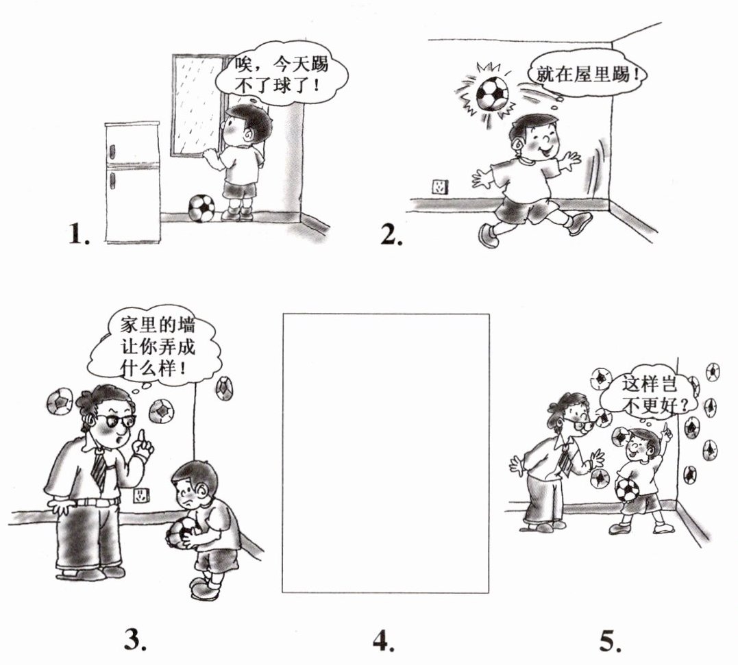 五、你能根据画面内容,把缺少的一幅图画出来吗? 再请你将五幅图连起来写一个完整的故事。