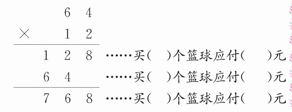6. 王老师买了 12 个篮球,每个篮球 64 元。根据下面的竖式,在括号里填上合适的数。