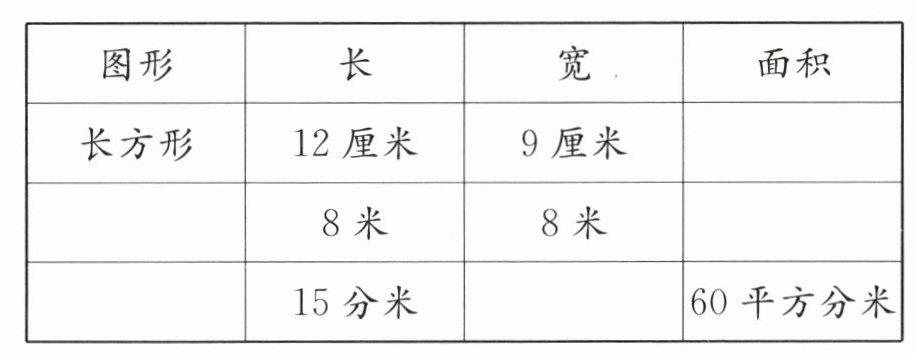 (注:因图片无法直接显示,根据常见表格结构及答案推测,答案依次对应表格中面积、形状、面积、形状、边长等空,分别填入)
