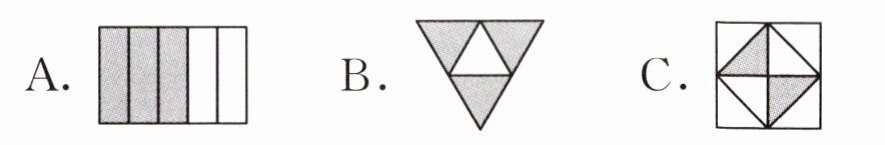 1. 下面各图中,涂色部分能用$\frac{3}{4}$表示的是(