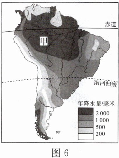 (3)南美洲降水丰富(或南美洲大部分地区年降水量在 1 000 毫米以上)。(言之有理即可)