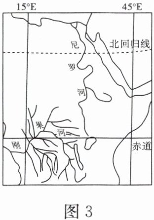 (2024安庆期末)图3所示非洲两条主要河流中,尼罗河流经北回归线,刚果河流经赤道。据此完成5、6题。