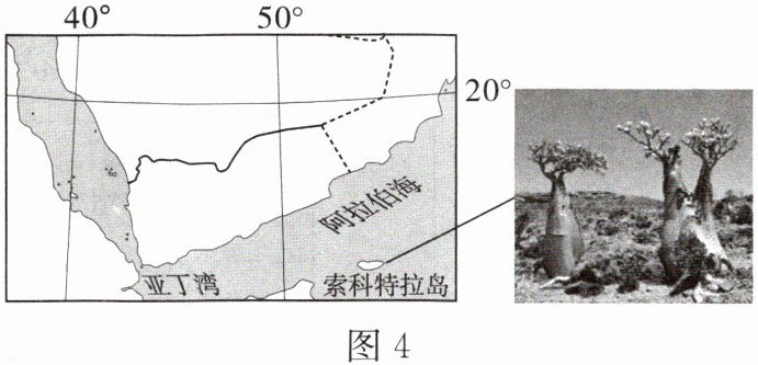 (2024东营二模)索科特拉岛石灰岩遍布,岛上有许多奇特的动植物,如“沙漠玫瑰”直接嵌进石头里,完全不需要土壤,喜高温干燥和阳光充足的环境,树皮像橡胶一样闪闪发亮,枝干顶端长出漂亮的粉红色花朵。图4示意索科特拉岛位置和“沙漠玫瑰”景观图。读图,完成7、8题。