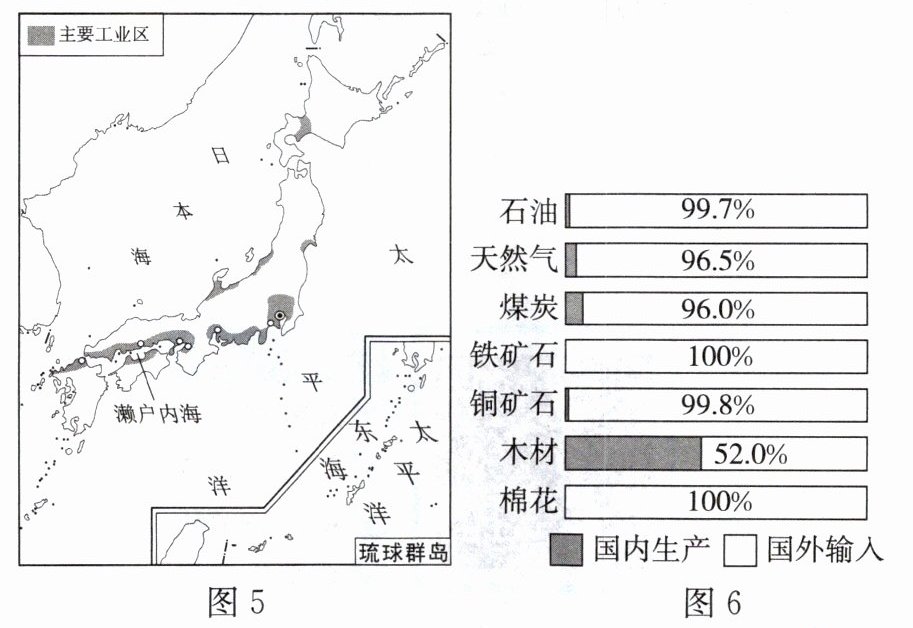 11. 图 5 为日本主要工业区分布示意图,图 6 为日本主要原料和燃料来源占比示意图。读图,完成下列问题。