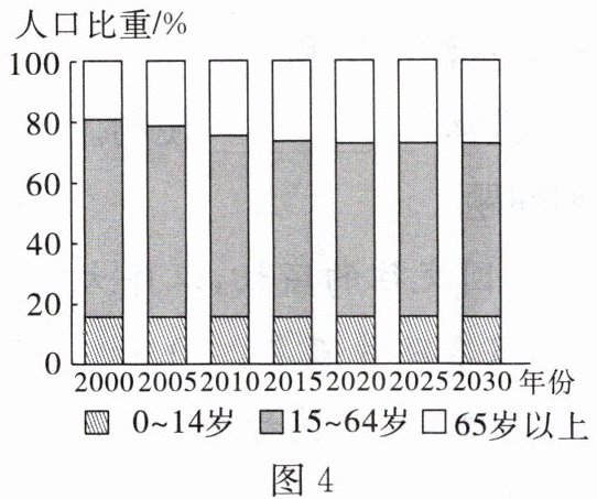 日本是机器人研制、出口和使用大国。日本经济产业部预计,到 2030 年护理机器人的需求规模将扩大 20 倍。图 4 为 2000-2030 年日本人口年龄结构图(含预测)。据此完成 8~10 题。