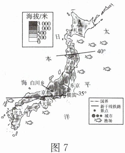 材料 隋唐时期,随着与中国交往的密切,汉字大量传入日本。后来日本借鉴汉字笔画和部首发明了平假名及片假名。20 世纪 90 年代,日本九州岛利用本国的优势条件发展新兴电子工业,故被称为日本的“硅岛”。图 7 为日本四大岛屿及其周边海域示意图。