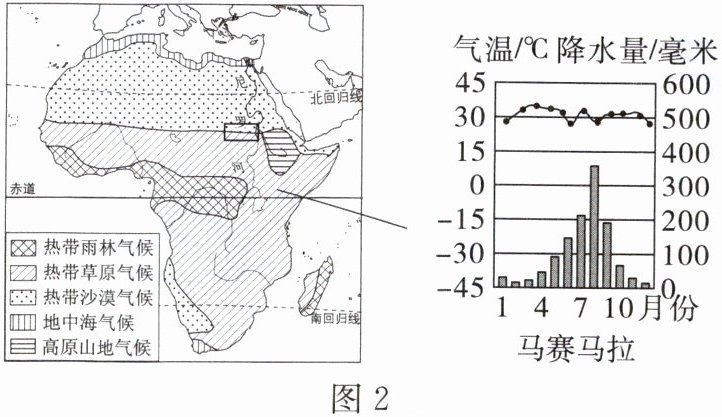 图2示意该保护区在非洲的位置及当地气候特征。读图,完成3~5题。
