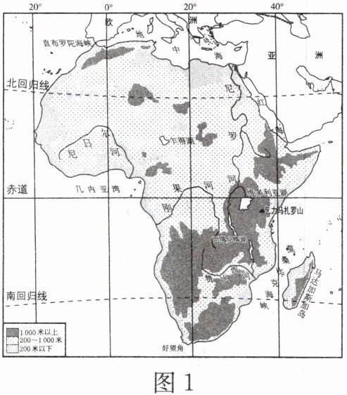 中国—非洲经贸博览会是落实中非合作论坛的重要举措,是中国同非洲各国经贸合作和交流对话的重要平台。读非洲地形分布图(图1),完成1、2题。