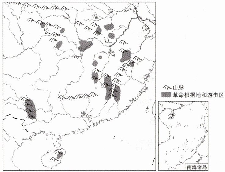 2. 图示革命根据地和游击区共同的地理环境特征是()。