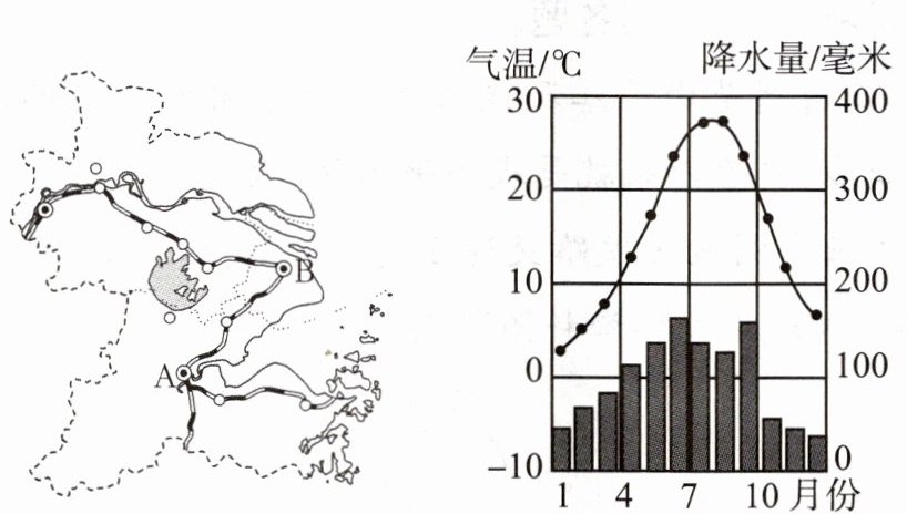 11. 读“长江三角洲地区示意图”及“B 城市气温曲线和降水量柱状图”,完成下列各题。
