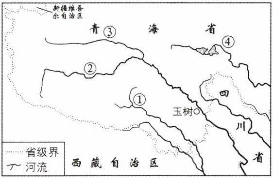 三江源地区位于青海省,是长江、黄河、澜沧江的发源地。读“三江源地区示意图”,完成1、2题。