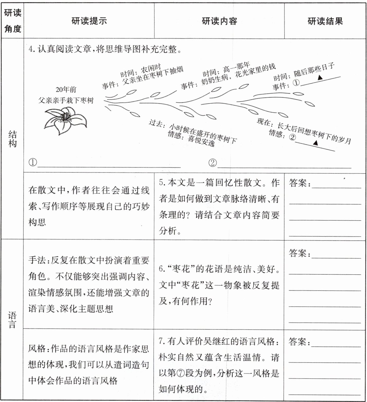 4. ①父亲更早出晚归辛勤工作 ②怀念、愧疚 5. ①明暗线交织,条理清晰。将枣花作为明线,串起“我”和父亲关于枣树、枣花的故事,暗线则是父爱,表达了“我”对父亲的感激、怀念之情。②采用时间顺序。“小时候、高一时、上大学、毕业后”,按照时间顺序叙述故事,使文章条理清晰,中心突出。 6. ①枣花是贯穿全文的线索,使文章脉络清晰。②通过对枣花开时一家人在树下乘凉、洗衣等场面的描写,营造了温馨的氛围,表达了对那段岁月的怀念。③枣花是父爱的象征,塑造了一个为子女日夜操劳、默默付出的父亲形象,赞扬了父爱的伟大和无私,突出主题。④枣花寄托了“我”对父亲的怀念和感激之情。 7. ①语言朴实:没有刻意渲染,也没有过多修饰,口语色彩浓厚,“叫到了枣树下”“吸了半天烟”“一直在轻轻地颤抖”等词句通俗易懂。②蕴含生活温情:“五妮啊”“家里的事你甭管”等词句富有生活气息,字里行间表现出父亲对“我”的期望、疼爱和支持,看似平淡,但蕴含温情。表现了父亲由内心挣扎、犹豫到最后下定决心让“我”继续读高中的心理过程,蕴含父亲对“我”的支持和疼爱。