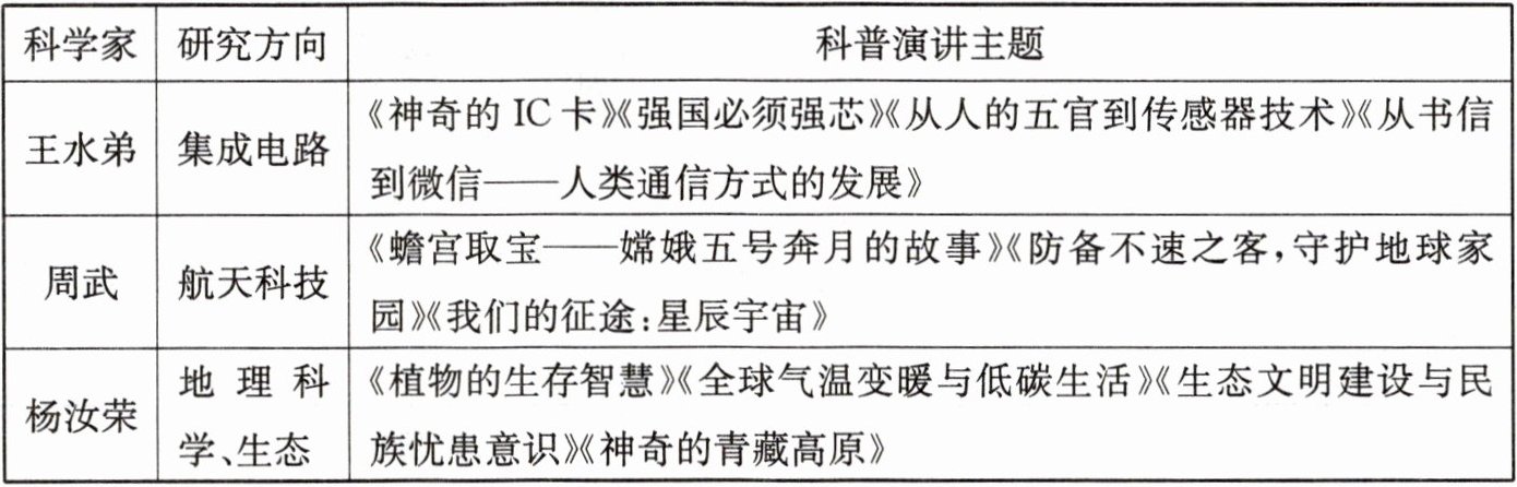 9. “弘扬科学精神,做好科学教育加法。”2025 年“大手拉小手科普报告会”校园巡讲活动来到学校,假如听完报告后你有机会采访科普宣讲团的科学家,你会向他提什么问题呢? 请从下列科学家中任选一位,结合其研究方向和演讲主题提出两个问题。