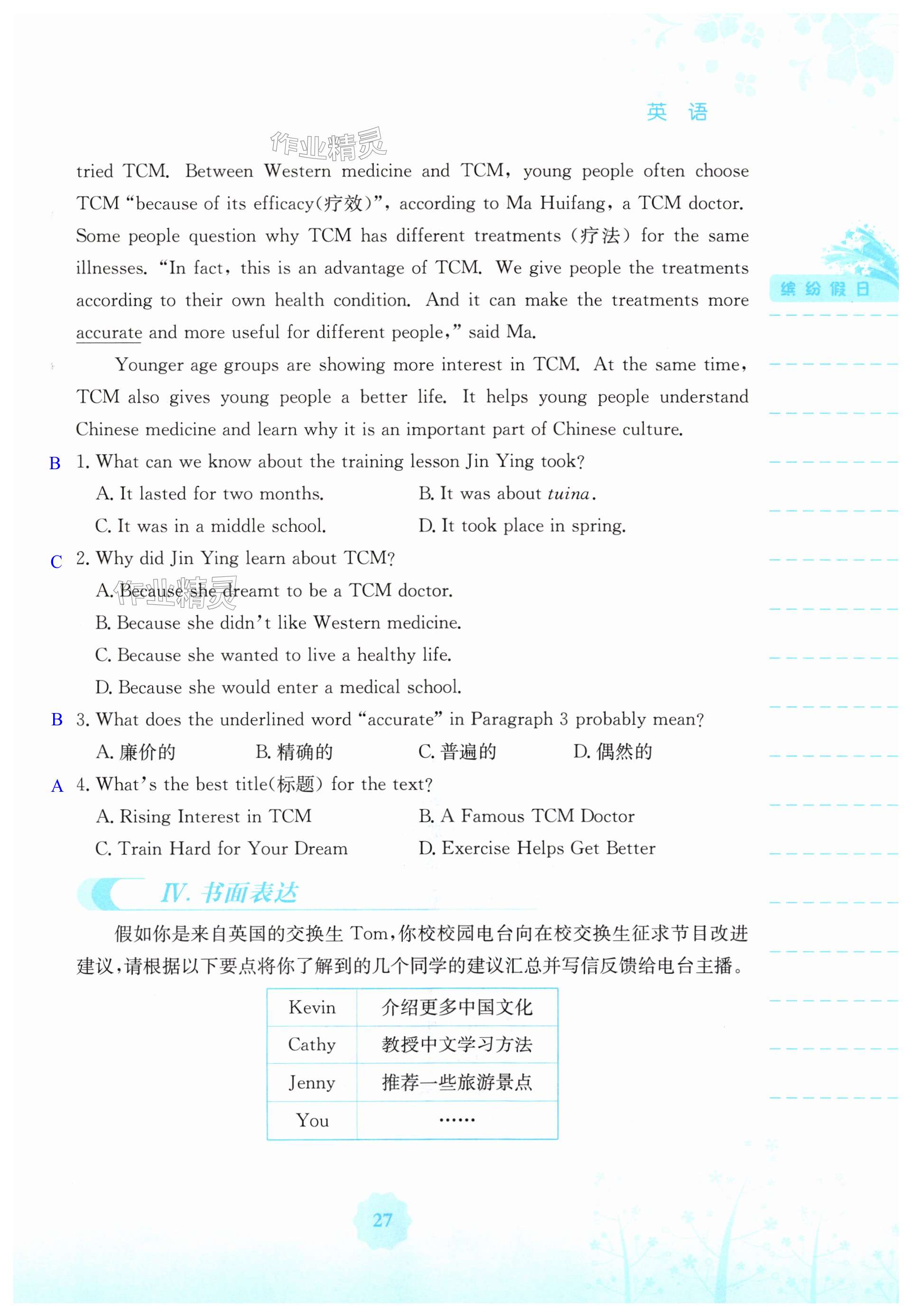 注:目前有些书本章节名称可能整理的还不是很完善,但都是按照顺序排列的,请同学们按照顺序仔细查找。练习册 2025年暑假生活八年级英语人教版安徽教育出版社 答案主要是用来给同学们做完题方便对答案用的,请勿直接抄袭。