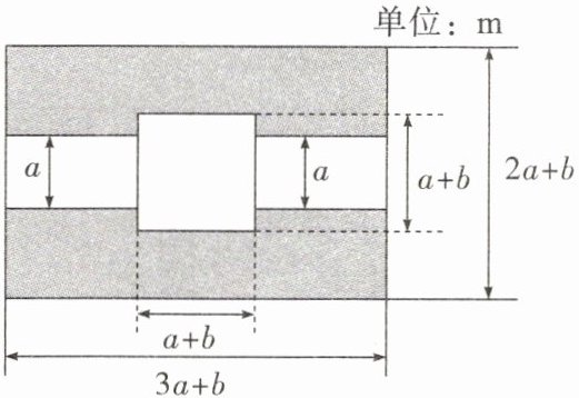 14. 如图所示,某市有一块长为$(3a + b)m$、宽为$(2a + b)m$的长方形地块,规划部门计划将阴影部分进行绿化,中间将修建一座雕像,左右两边修两条宽为$a m的道路(a > 0,b > 0)$。