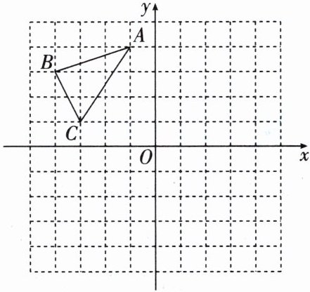 14. 如图所示,在边长为 1 个单位长度的小正方形网格中建立平面直角坐标系。已知三角形 ABC 的顶点 A 的坐标为$(-1,4)$,顶点 B 的坐标为$(-4,3)$,顶点 C 的坐标为$(-3,1)$。