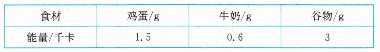 若用以上三类食材制作这份营养早餐,其中鸡蛋约 60 g,请你帮助李华计算这份早餐中需要牛奶和谷物各多少克.