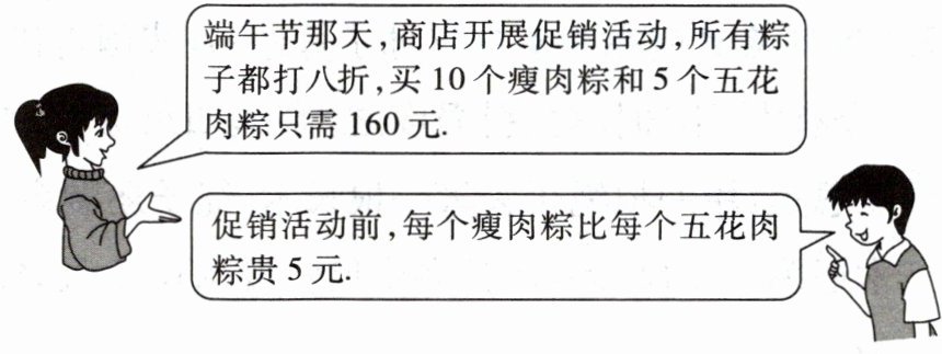 12. (2024 海南)端午节是中国的传统节日,人们有吃粽子的习俗. 某商店售卖某品牌瘦肉粽和五花肉粽. 请依据以下对话,求促销活动前每个瘦肉粽、五花肉粽的售价.