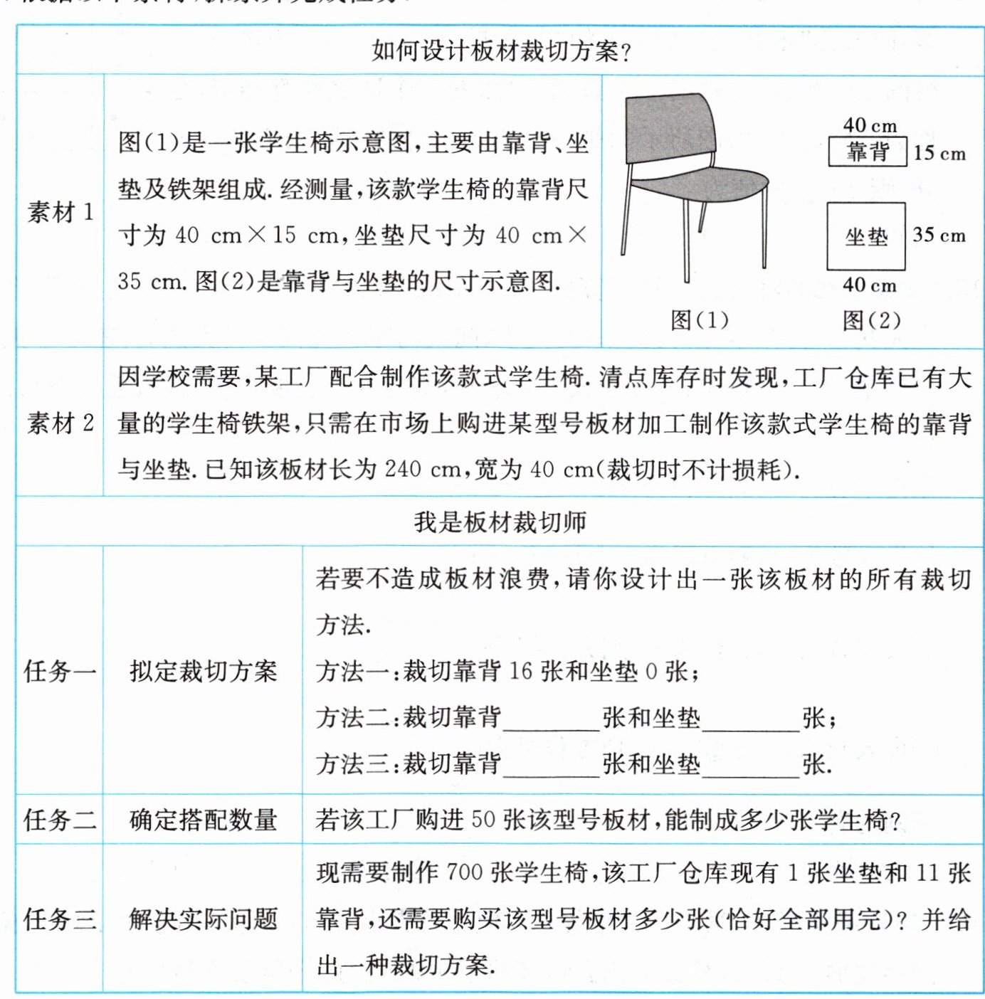 $\therefore$方法二:裁切靠背9张和坐垫3张;