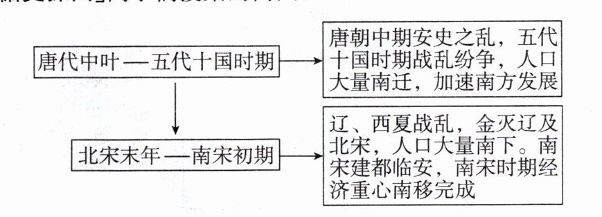 (2)原因:北方战乱不断,南方相对安定,有利于经济发展;北民南迁补充了劳动力,带去了中原先进的生产技术;南方统治者重视发展经济;南方劳动人民的辛勤劳作;南宋时政治中心的南移。