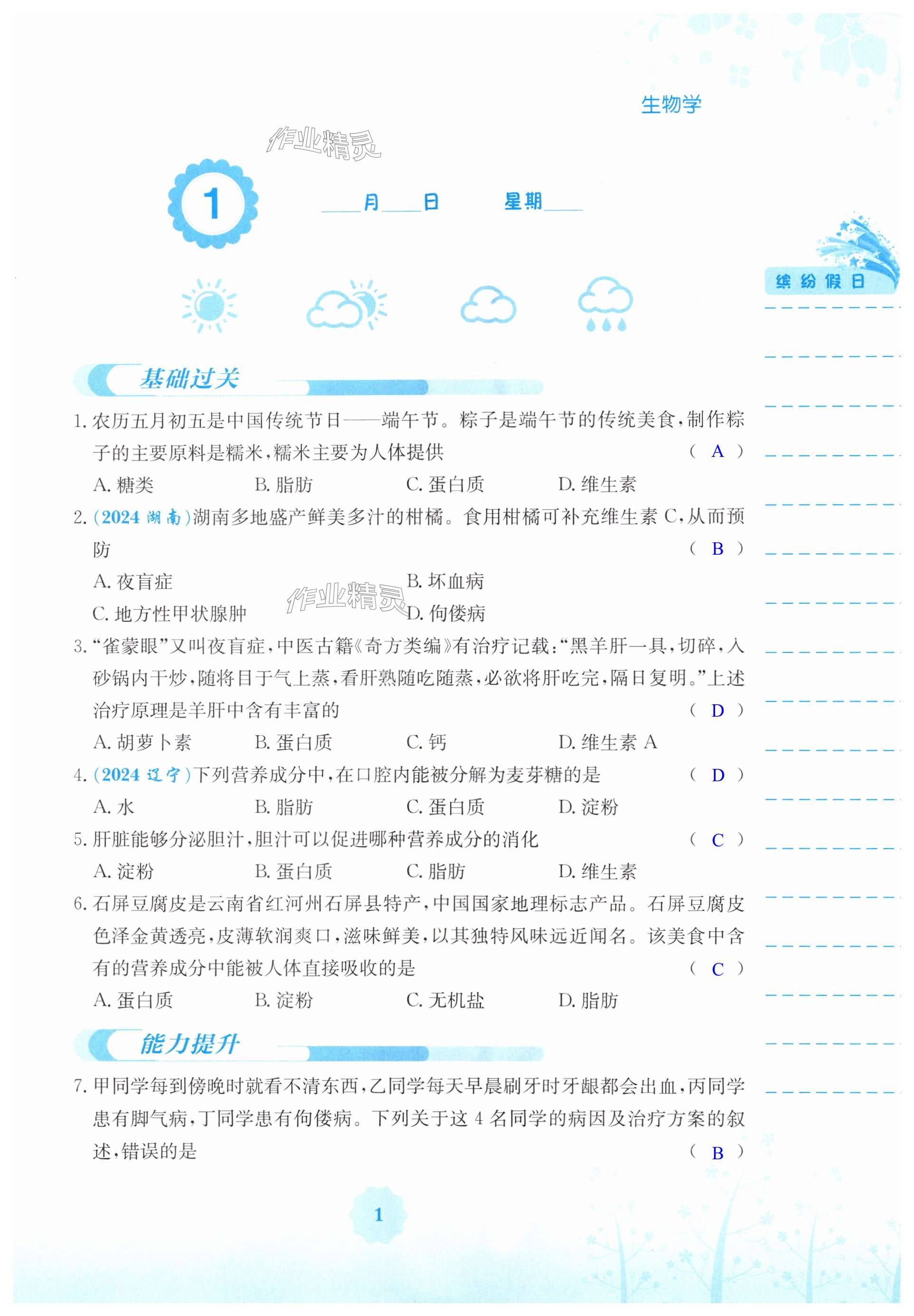 注:目前有些书本章节名称可能整理的还不是很完善,但都是按照顺序排列的,请同学们按照顺序仔细查找。练习册2025年暑假生活安徽教育出版社七年级生物北师大版答案主要是用来给同学们做完题方便对答案用的,请勿直接抄袭。