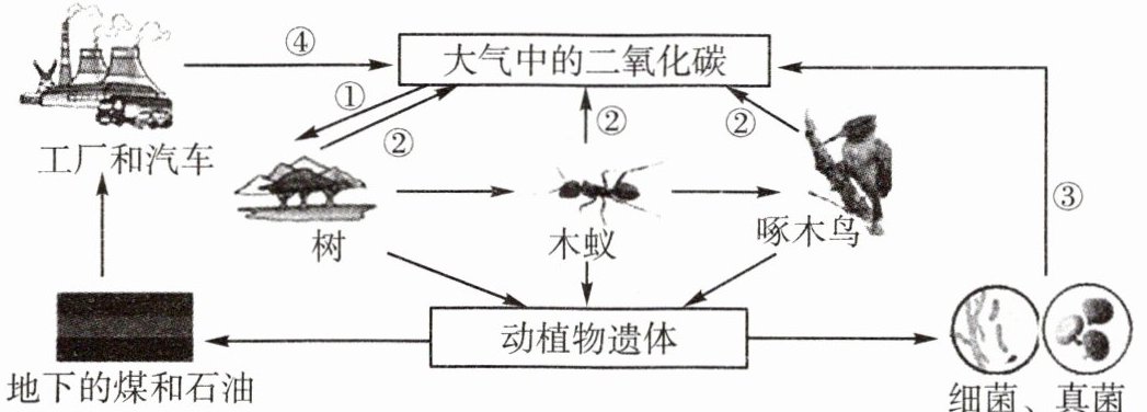 (1)图中二氧化碳的排放包括 (填图中序号)三种途径,其中 (填图中序号)途径是导致温室效应增强的主要原因。
