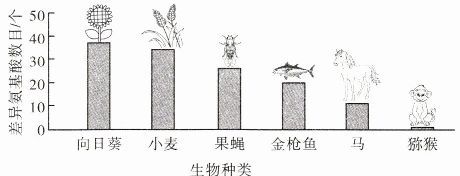 1. (2024·河南)比较各种生物的同一种蛋白质(如细胞色素c)的氨基酸组成,可判断它们之间的亲缘关系。几种生物的细胞色素c与人类的相比,存在差异的氨基酸数目如图所示,其中与人类亲缘关系最近的是( )。